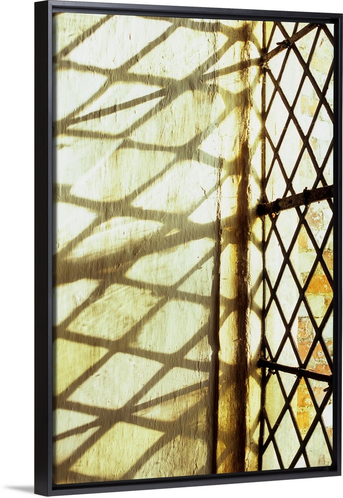 <p>Detail of stone-framed window with diamond-leaded panes of clear or pale yellow glass throwing shadows onto niche wall</p>