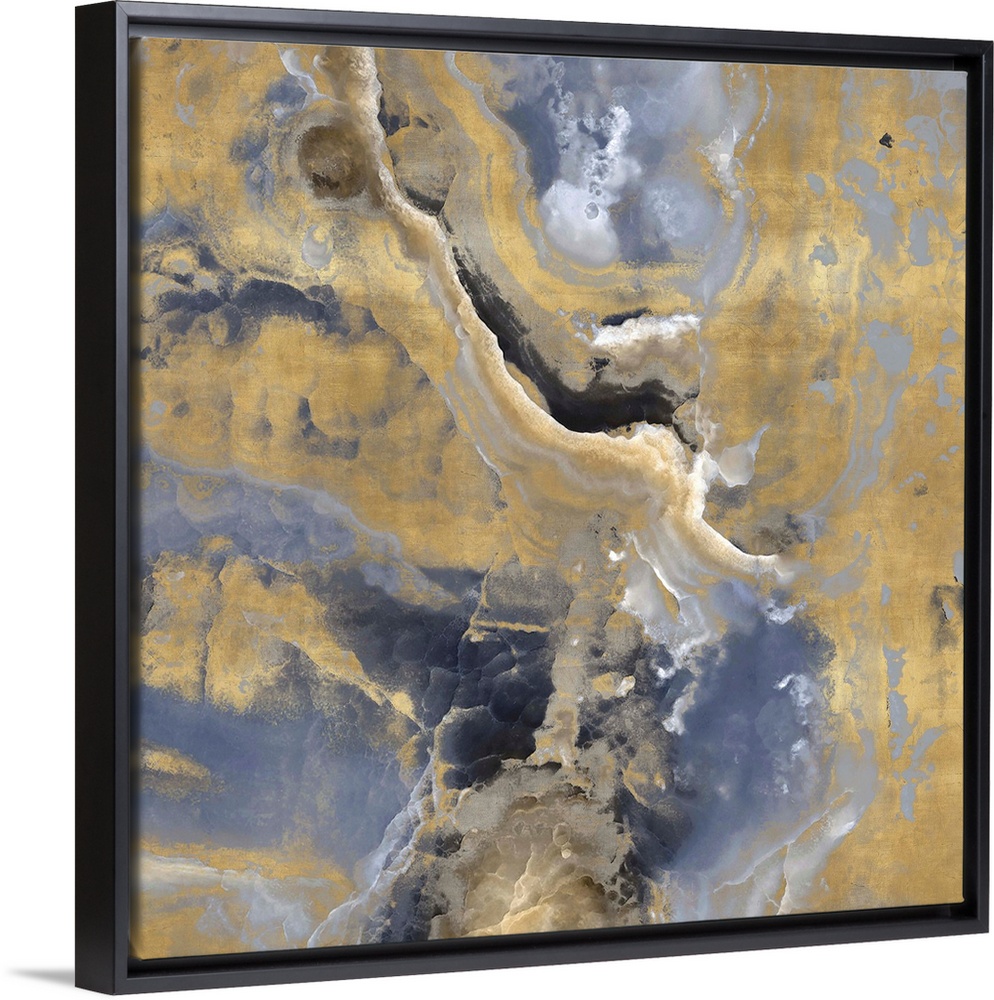 <p>Contemporary artwork featuring a deluge of bluish grays and soft gold colors that have been edited to a marble effect.</p>