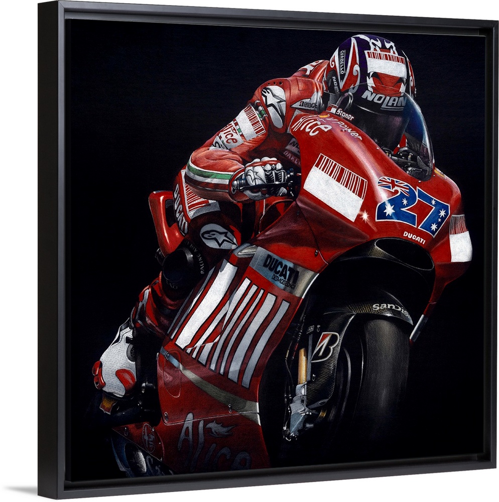 <p>Square illustration of a red, white, and blue Ducati racing bike in action, on a black background.</p>