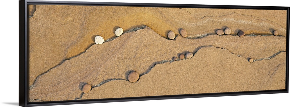<p>Soft pebbles lay in the cracks of sand near Lake Superior and are pictured in panoramic view.</p>