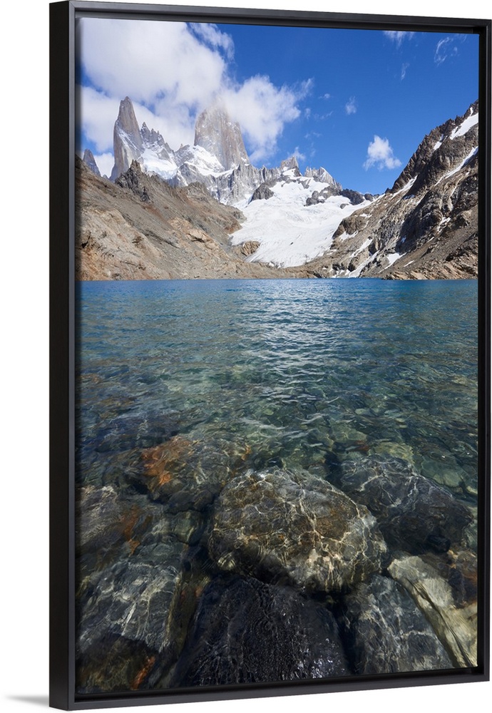 <p>Stones seen through the water of Lago de los Tres featuring Monte Fitz Roy in the background, Patagonia, Argentina, South America</p>