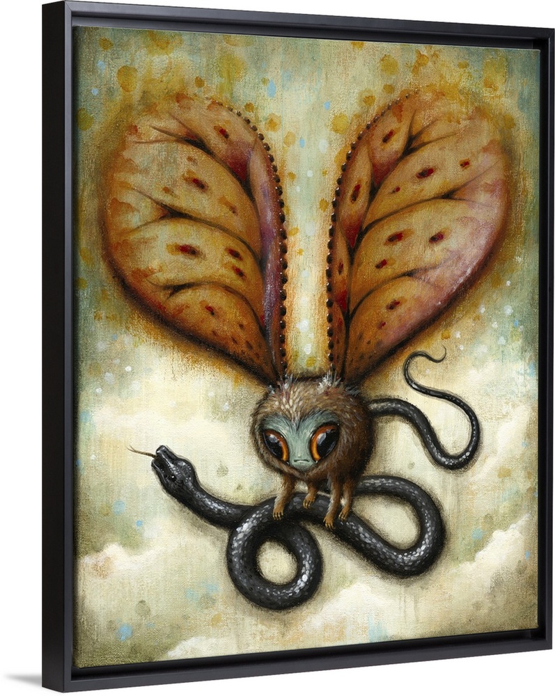 <p>Surrealist painting of a winged creature carrying a snake in the air.</p>