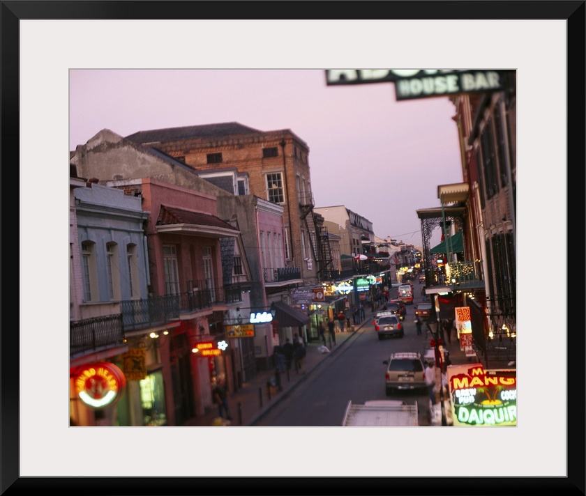 <p>Landscape, large photograph looking down Bourbon Street in New Orleans, Louisiana. Rows of storefronts with neon signs lit at dusk.</p>