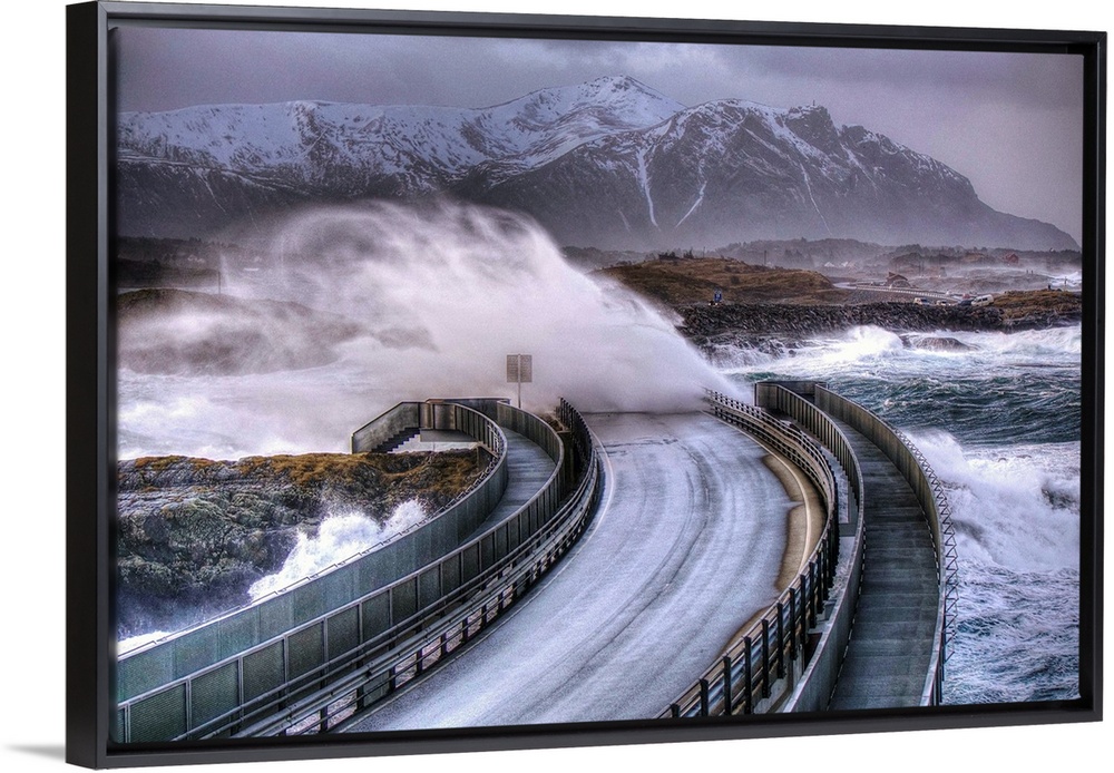 <p>Waves crashing over a road as a car speeds away from a coming storm, Norway.</p>