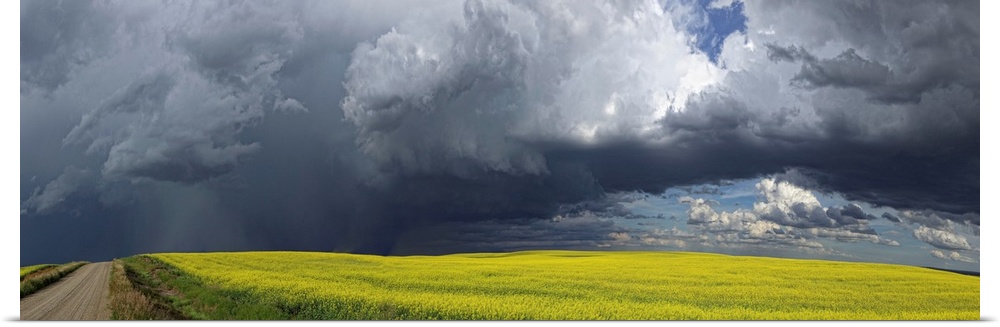 <p>Panoramic of storm clouds gather over a sunlit canola field and country road; Alberta, Canada</p>