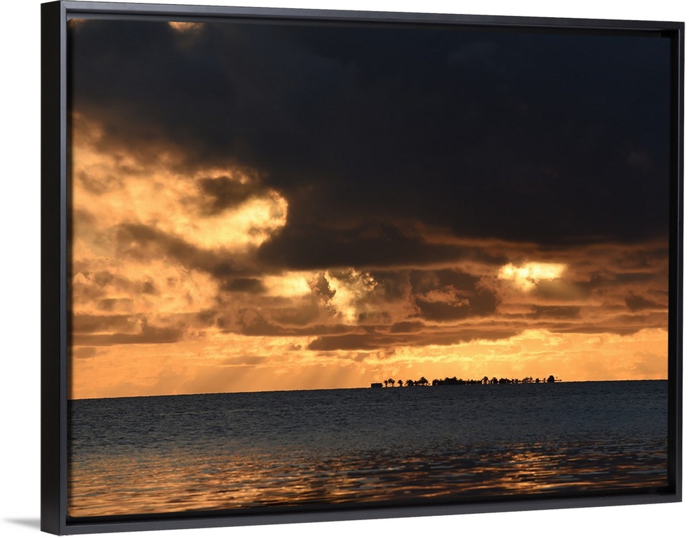 <p>Dark storm clouds over the ocean in Belize at sunset, Caribbean.</p>