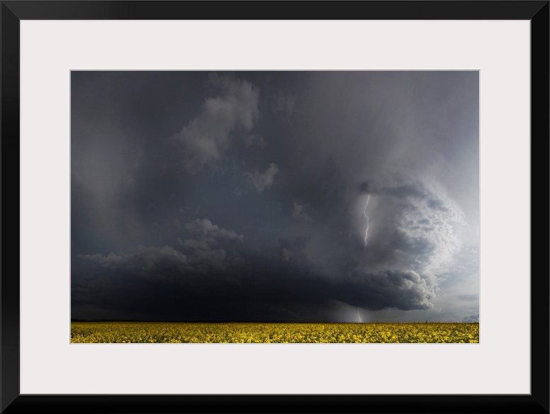 <p>Dark storm clouds with lightning looming over a canola field.</p>