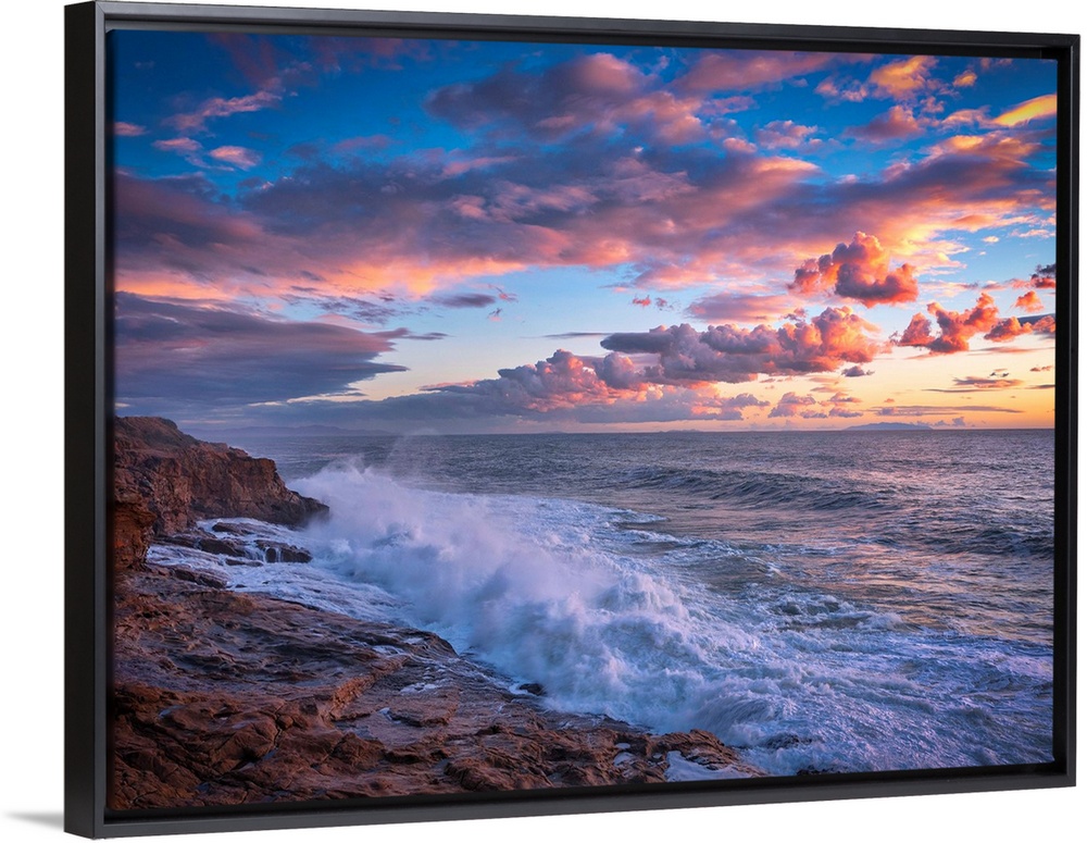 <p>Beautiful photograph of a warm, cloudy sunset over the ocean with crashing waves onto the rocky shore.</p>