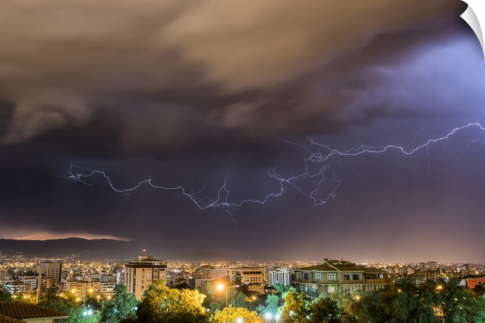 <p>Stormy skies and lightning over a city at night; Cochabamba, Bolivia</p>