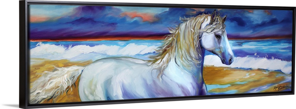 <p>Panoramic painting of a white horse with a beach blown mane on the shore with the ocean and dramatic clouds in the background.</p>