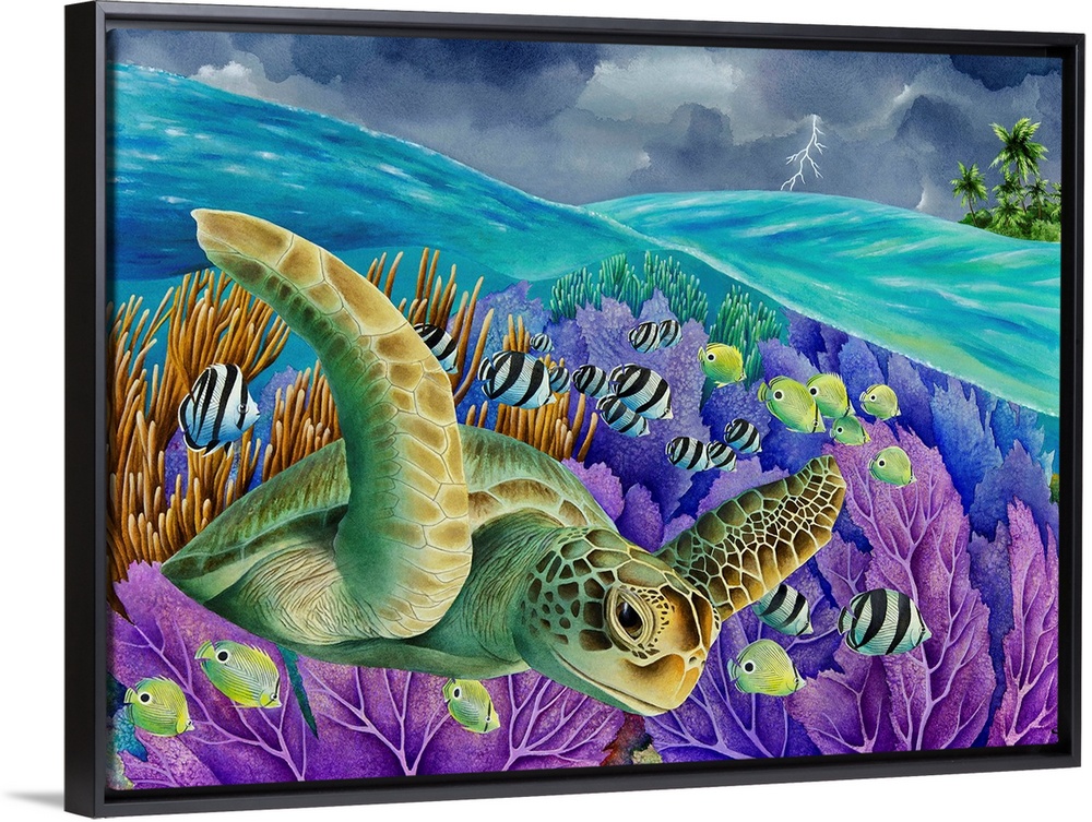 <p>Whimsy watercolor painting of a sea turtle surrounded by tropical fish in the reefs, while overhead is an overcast, stormy sky with lightning.</p>