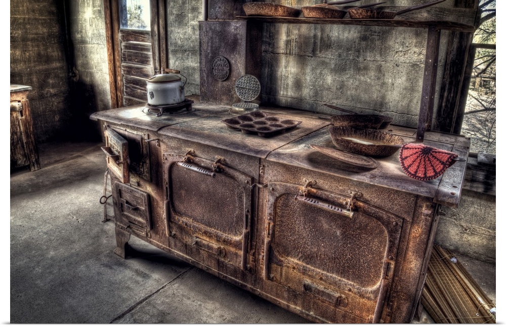 <p>An old, rusty cook stove found in the gold mine kitchen.</p>