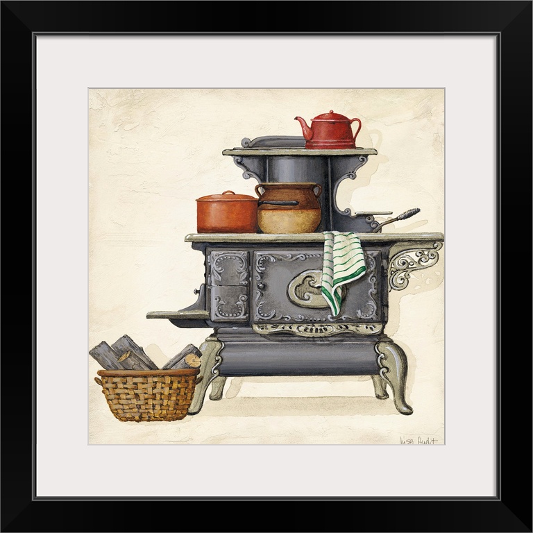 <p>Old fashioned stove with beanpot, teapot and towel. Basket of wood on floor.</p>