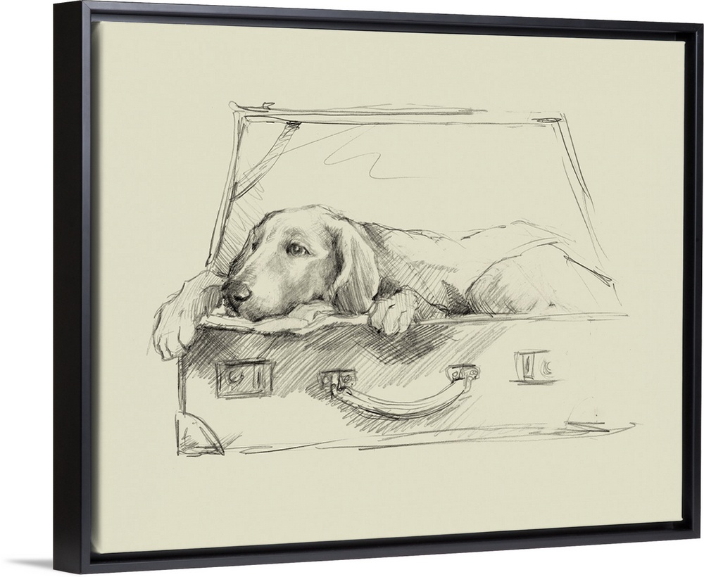 <p>Sketch style illustration of a dog laying in an open suitcase.</p>