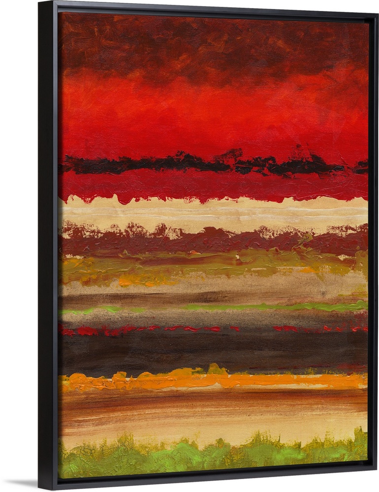 <p>Abstract painting of horizontal layers in shades of red and green.</p>