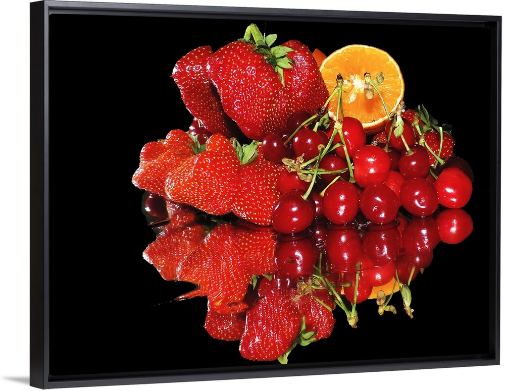 <p>A group of red fruits including strawberries, cherries, and a slice of orange, on a mirror.</p>
