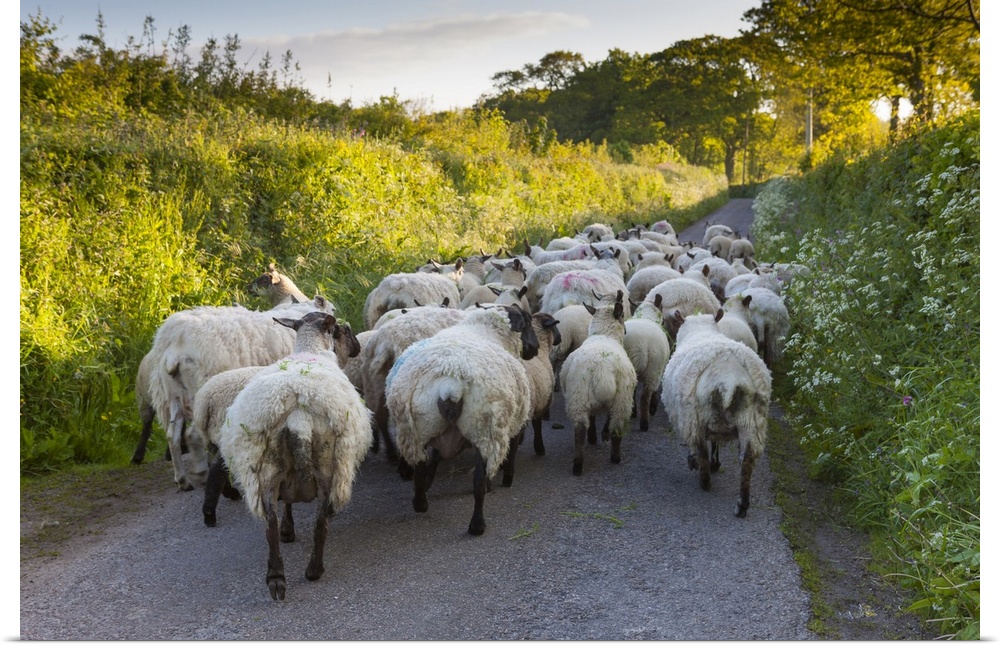 <p>Stray sheep block a narrow country lane.</p>