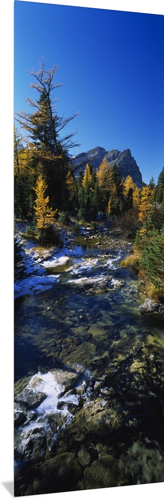 <p>Vertical panoramic canvas of water running through a forest with fall foliage and a rugged mountain in the background.</p>