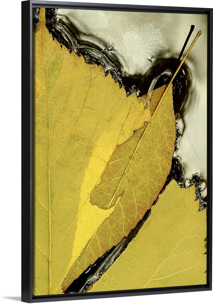 <p>Tall canvas print of the up close of half a leaf floating in water.</p>