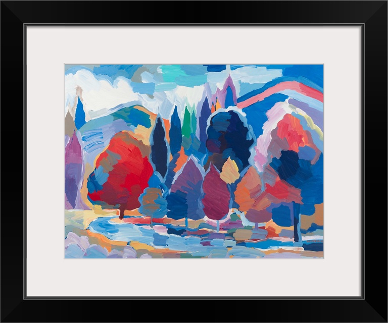 <p>Colorful abstract landscape with trees and mountains lining the side of a stream.</p>