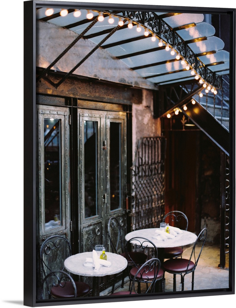 <p>A photograph of the tables and lights of a rustic mediterranean cafe.</p>
