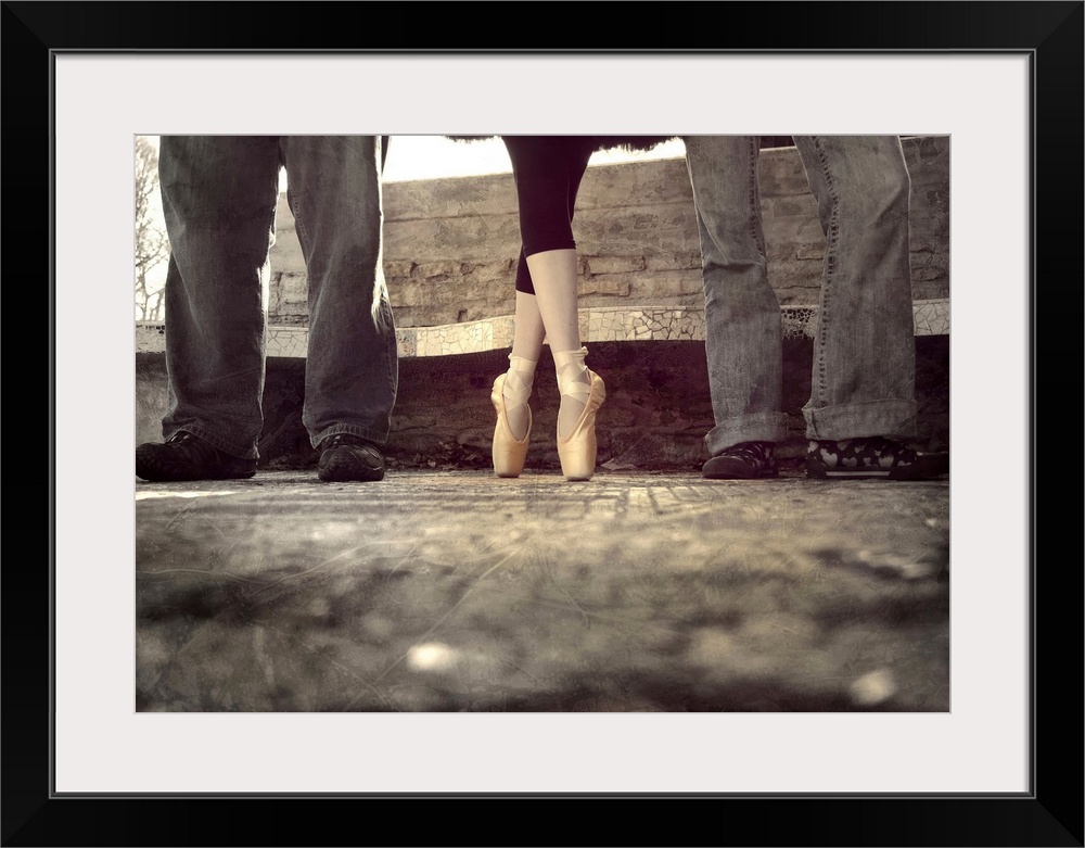 <p>Three people standing at a bus stop, with a ballerina in toe shoes in the middle.</p>