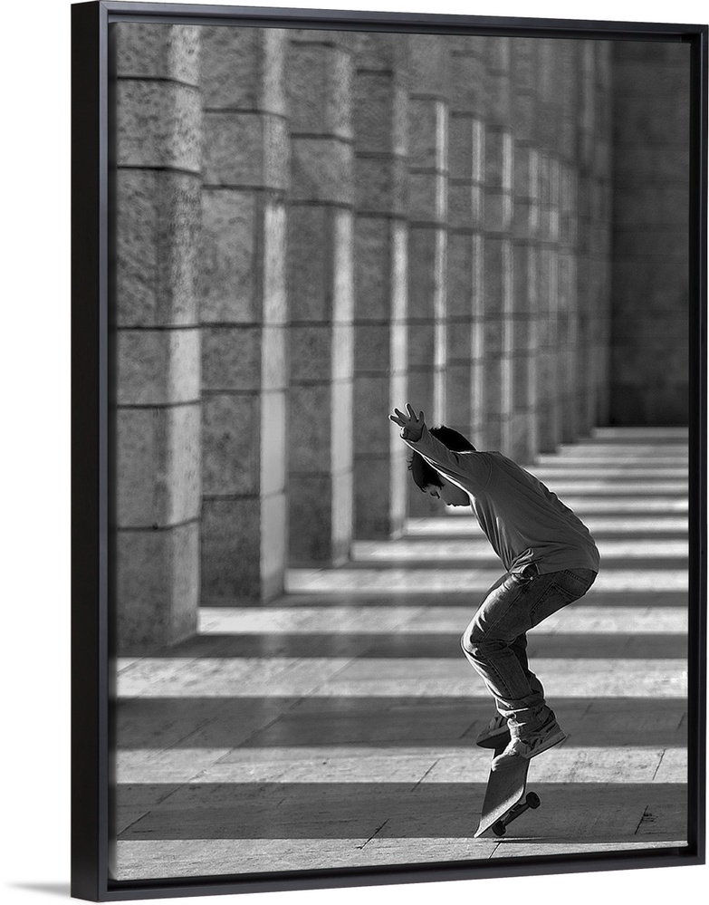 <p>Boy jumping with his skateboard by a row of columns casting long shadows.</p>