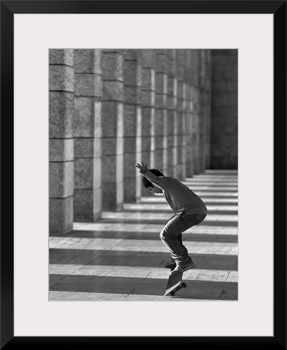 <p>Boy jumping with his skateboard by a row of columns casting long shadows.</p>