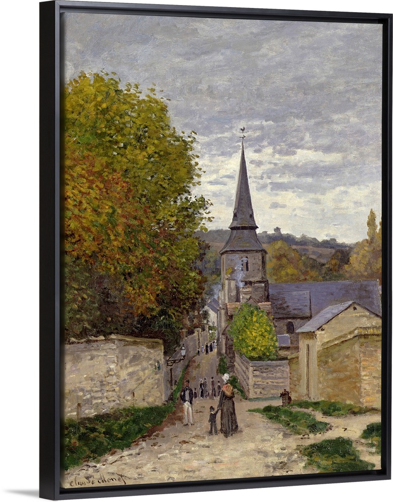 <p>Portrait, large classic artwork of a narrow street leading into a town, surrounded by small buildings and a stone wall on one side, with large trees behind it. Small groups of people are walking down the street on a overcast day.</p>