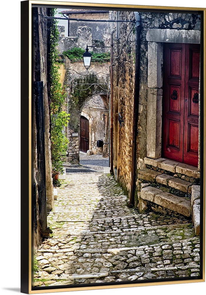 <p>Cobblestone street in Sermoneta, Italy, with a red door on the side.</p>