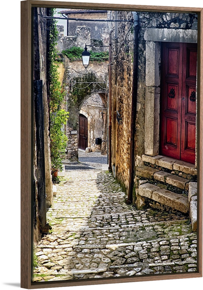 <p>Cobblestone street in Sermoneta, Italy, with a red door on the side.</p>