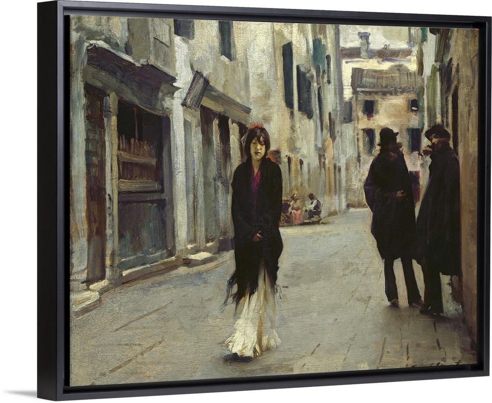 <p>Street in Venice, by John Singer Sargent, 1911, American painting, oil on wood panel. A young women walks alone in Venice, wearing a fringed black shawl which echoes the silhouette of two men on the right, all against the light tones of the street</p>