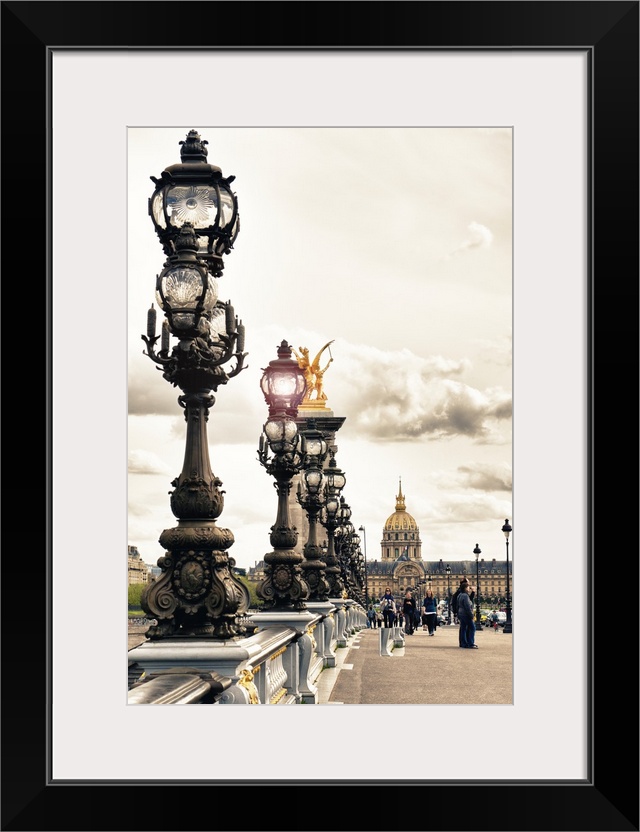 <p>Row of detailed iron street lamps on the Pont Alexandres III in Paris, France.</p>