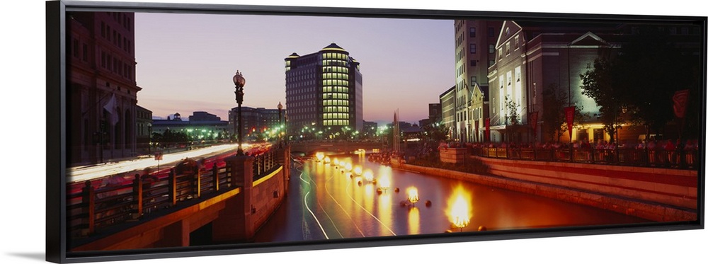 <p>Panoramic canvas photo of lights along a road that leads to buildings in a city at sunset.</p>