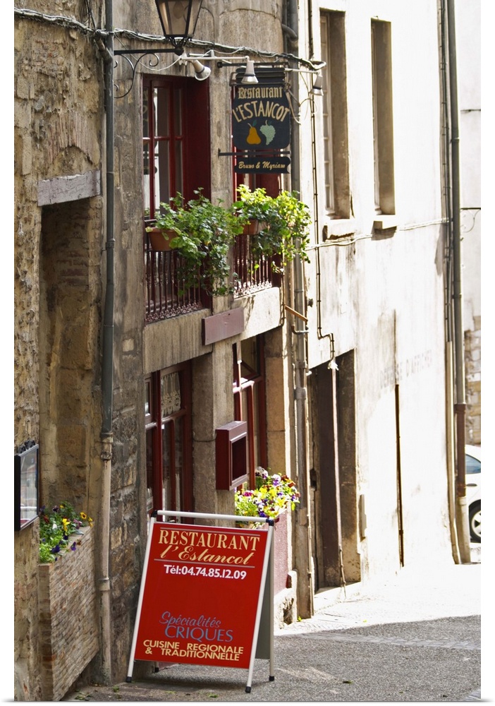 <p>A street scene in Vinenne, a restaurant called lEstancot in the old town, with a sign and flowers in the window. Vienne, Is..re Isere, France, Europe</p>