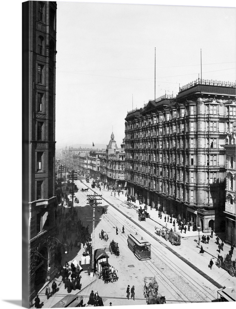 <p>San Francisco, CA: View of Streetcars passing the Palace Hotel. Photo circa 1900.</p>