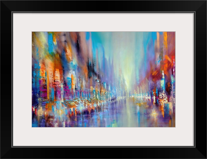 <p>Abstractly painted cityscape near the sea in bright colors and structures: a large, lively city in red, orange and blue with the silhouette of skyscrapers. Reflection of the lights in the water.</p>
