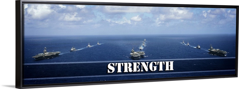 <p>Inspirational panoramic photograph of three lines of Navy ships in the middle of the ocean with "Strength" written in white across the bottom.</p>