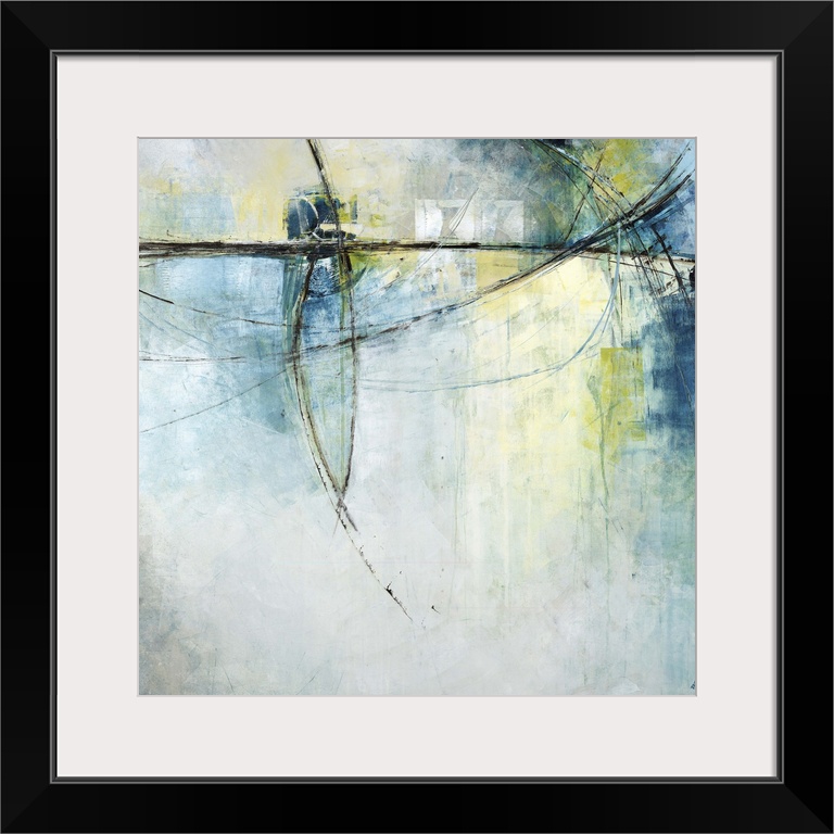 <p>Contemporary abstract painting of thin black lines against a faded green and blue background.</p>