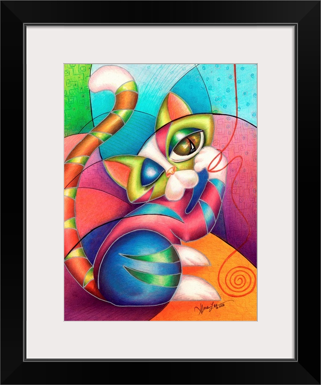 <p>Contemporary artwork in the style of cubism of a cat with yarn in bold colors.</p>