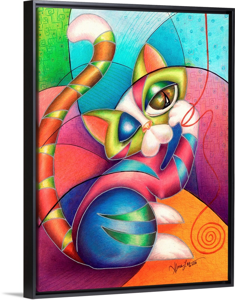 <p>Contemporary artwork in the style of cubism of a cat with yarn in bold colors.</p>