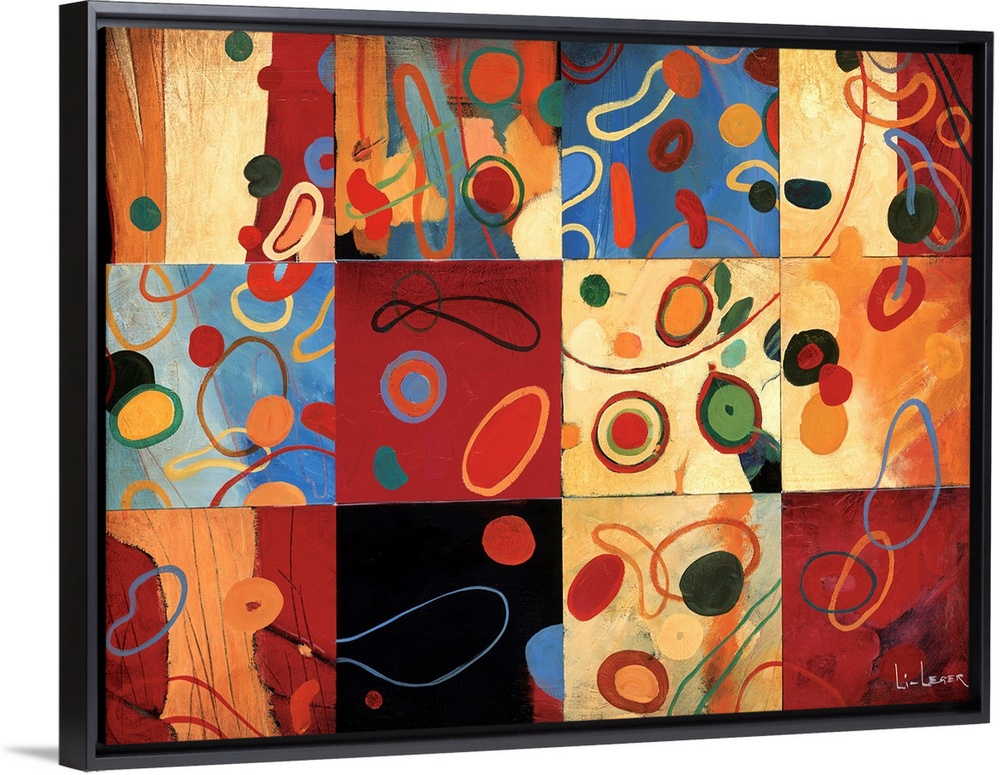 <p>Painting of multi-colored circular shapes on different colored backgrounds in a square grid design.</p>