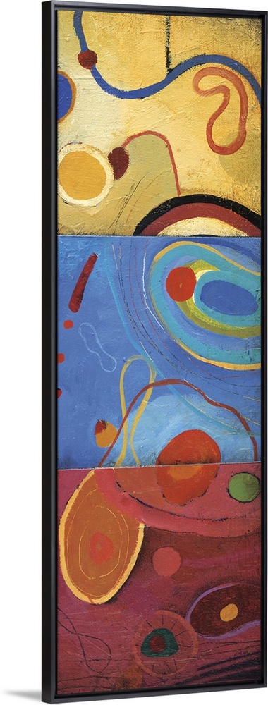 <p>Vibrant abstract painting in curved and circular shapes in colors of red, blue and yellow.</p>