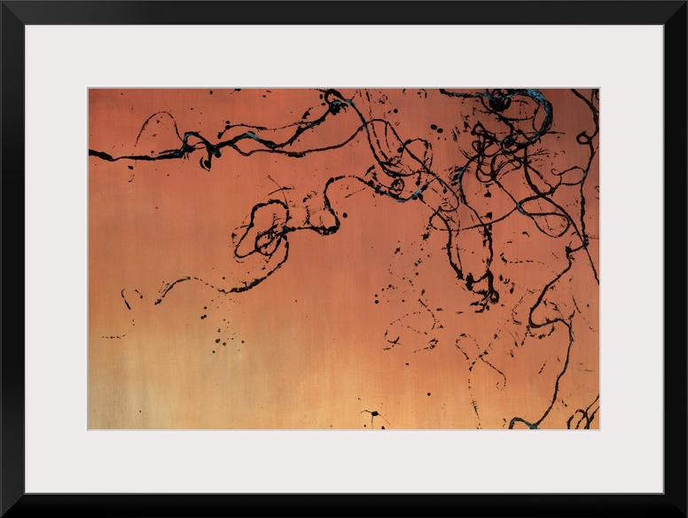 <p>Contemporary abstract artwork featuring wild dark lines splattered across a warm gradient background.</p>