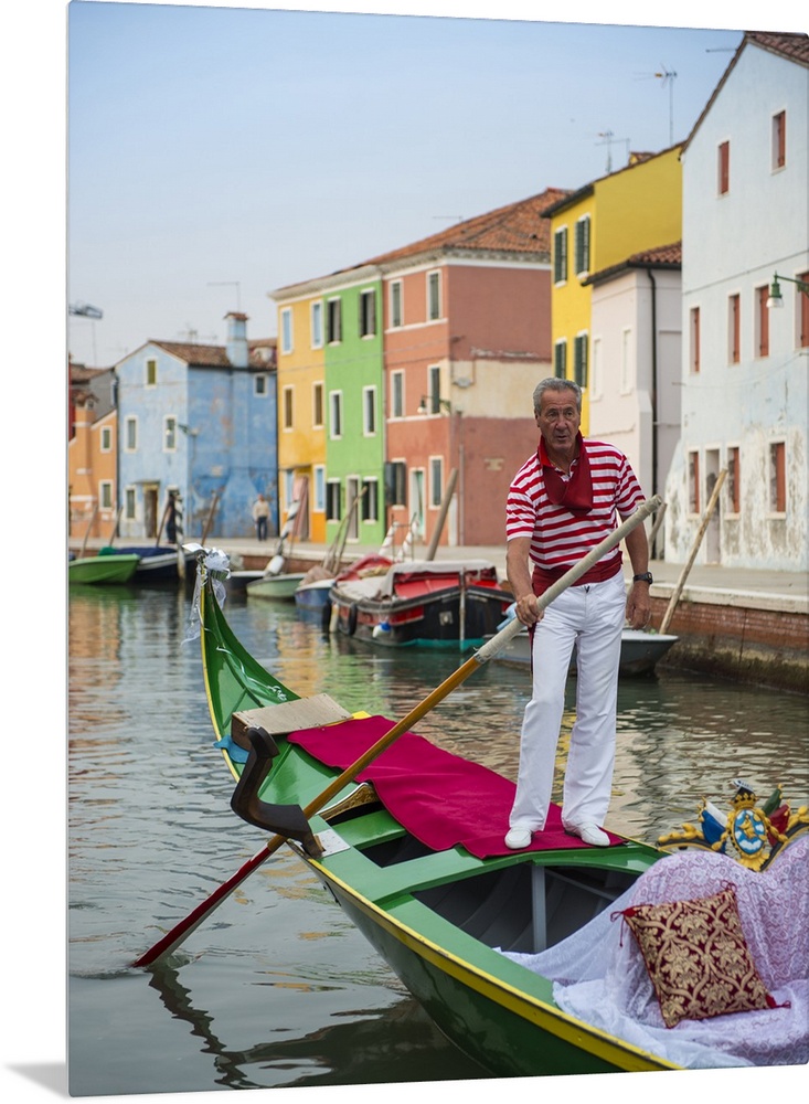 <p>Photograph of a gondolier wearing a red and white striped shirt, rowing through a canal lined with vibrant facades.</p>