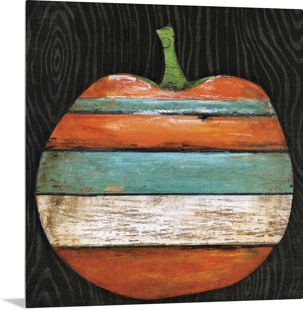<p>A wood painting of an orange, teal, black, and white striped pumpkin on a black background.</p>