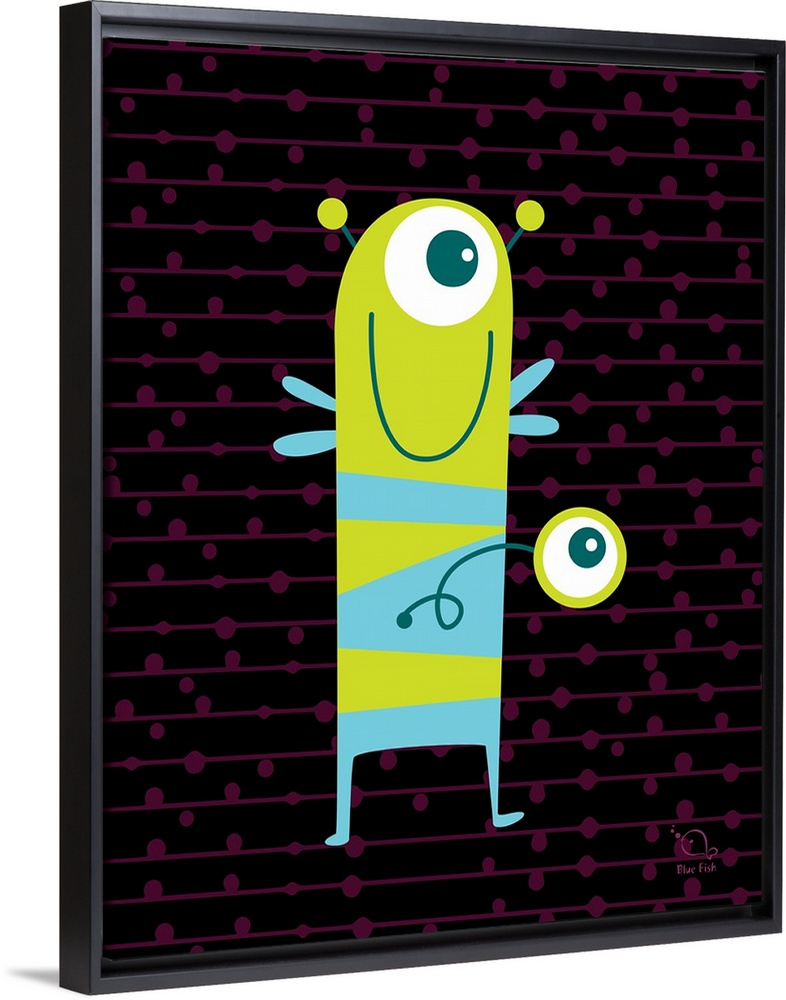 <p>Square illustration of a bright green and blue monster on a black and purple patterned background.</p>