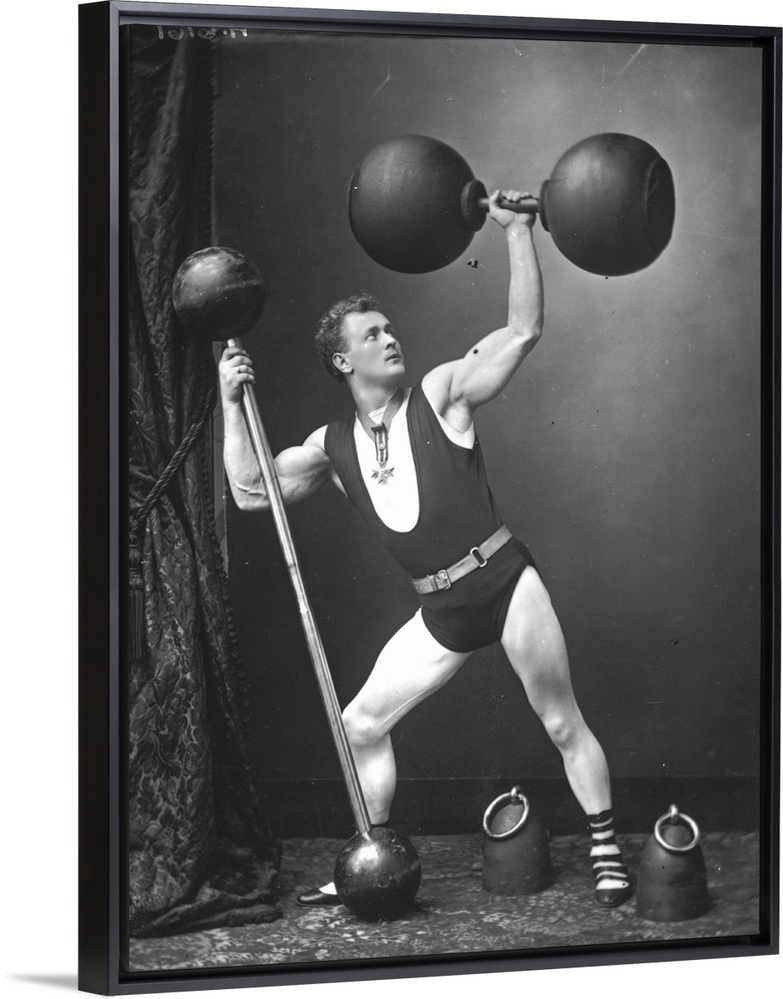<p>circa 1890: German strongman Eugene Sandow lifting weights and dumbbells</p>