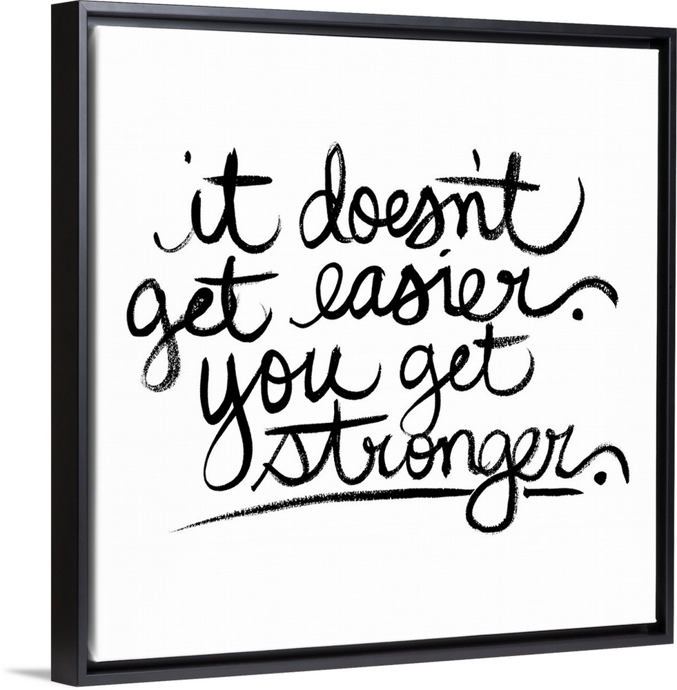 <p>Square decor with black handwritten text reading "it doesn't get easier. you get stronger" on a solid white background.</p>