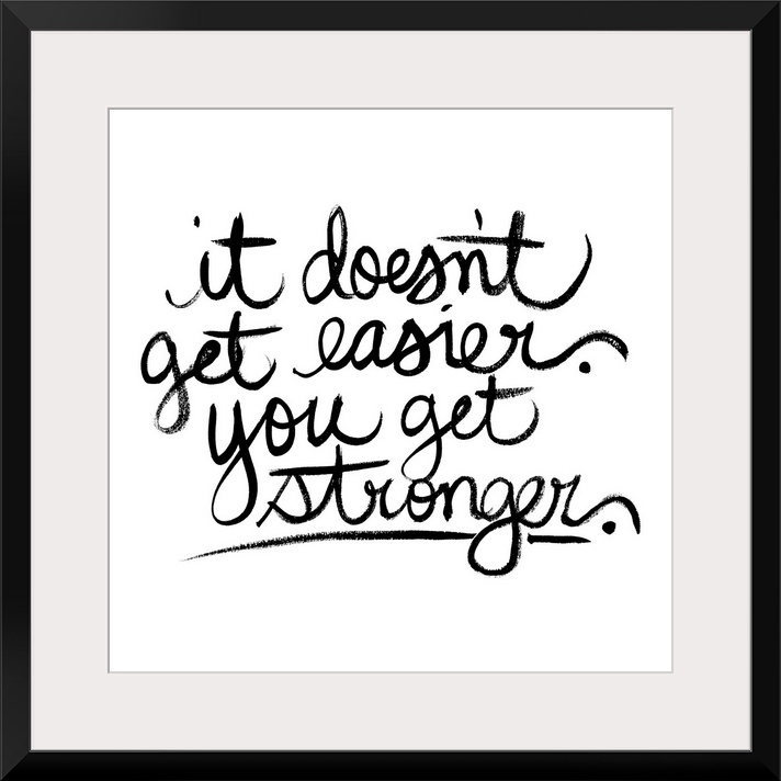 <p>Square decor with black handwritten text reading "it doesn't get easier. you get stronger" on a solid white background.</p>